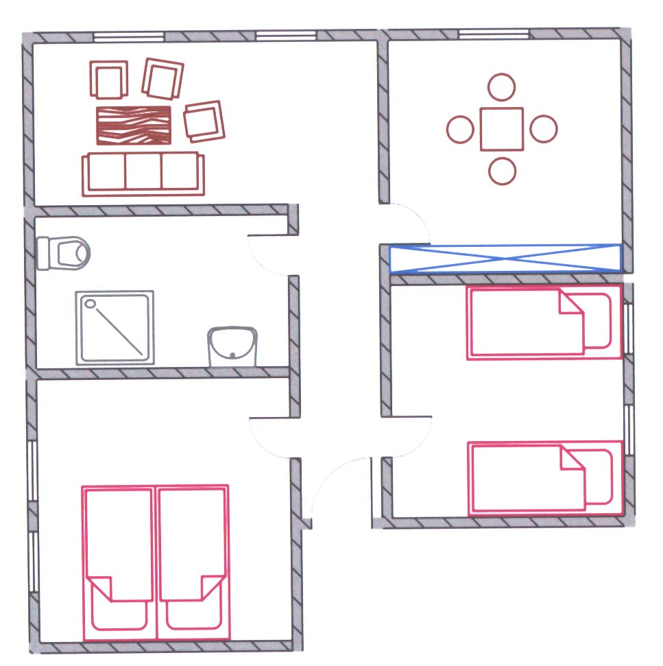 Die Wohnung 1 befindet sich im Obergeschoß und verfügt über zwei Schlafzimmer, einer voll ausgestatteten Küche mit Geschirrspüler, einem Wohnzimmer und WC/Dusche. Die Ferienwohnung ist ausgestattet mit WLAN, Sat.-TV und Radio.
